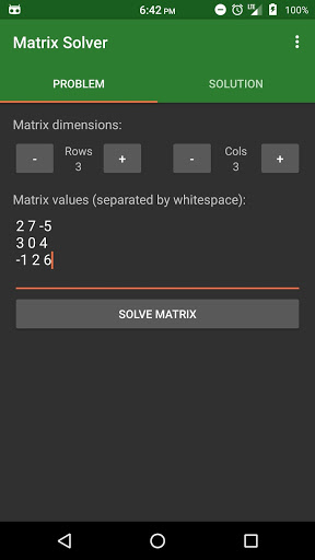 Solve any matrix by row-reduction. Simply select the dimensions, input the values, and hit solve! The matrix will be reduced to Row-Reduced Echelon Form (RREF).
