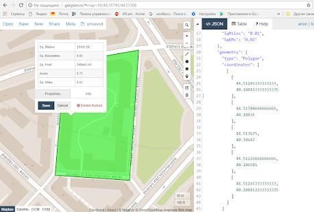 Untuk pengukuran kalkulator loopbacks simpul pertama dan terakhir dari poligon. Kemudian menghitung luas dan keliling. Setelah ukuran Anda dapat menyimpan poligon dan garis besar nya dalam format GeoJSON.