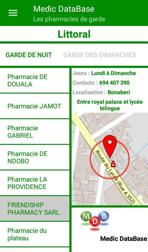 Aplikasi yang memungkinkan pengguna untuk lebih dekat dengan apoteker mereka (lokasi, kontak dan asuransi), untuk memiliki daftar apotek buka 24 jam sehari, mereka yang bertugas di akhir pekan dan malam hari. Dan akhirnya kartu panggil dokter berdasarkan spesialisasi.