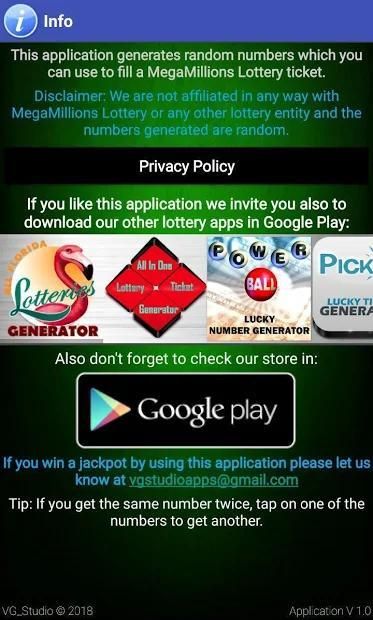 Aplikasi ini menghasilkan nomor Lotre MegaMillions acak yang dapat Anda gunakan untuk mengisi tiket MegaMillions. Juga, aplikasi memiliki fungsi untuk menahan nomor favorit Anda dan kemudian menghasilkan kombinasi dengan angka-angka lain yang tersisa.