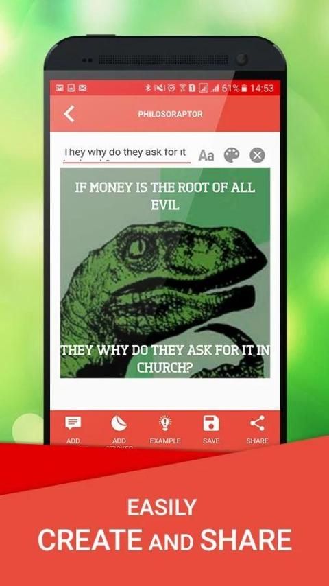 - Simpan ke penyimpanan dan berbagi meme Anda di Facebook, Whatsapp atau di mana saja
