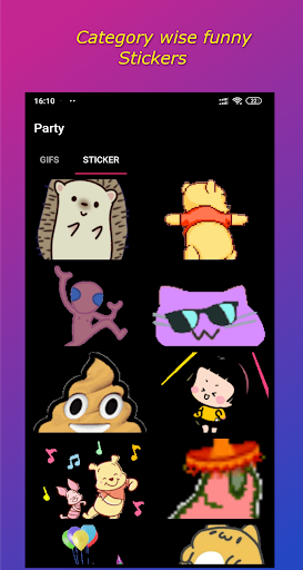 Kategori untuk GIF dan Stiker termasuk tetapi tidak terbatas pada Lucu , Marah, sarkasme, film, gif bollywood, stiker hollywood, teman, stiker seluler. Tahun Baru 2019, Natal 2018, Game of Thrones, Punya