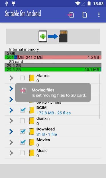 Dengan cepat memindahkan foto, video, atau unduhan dari perangkat Anda ke KARTU MEMORI. Program ini sangat berguna untuk perangkat dengan kapasitas memori internal kecil yang tidak memungkinkan ponsel untuk menyimpan konten yang diambil langsung pada KARTU MEMORI atau bagi pengguna yang ingin cepat dan mudah mem-backup file ke KARTU MEMORI.