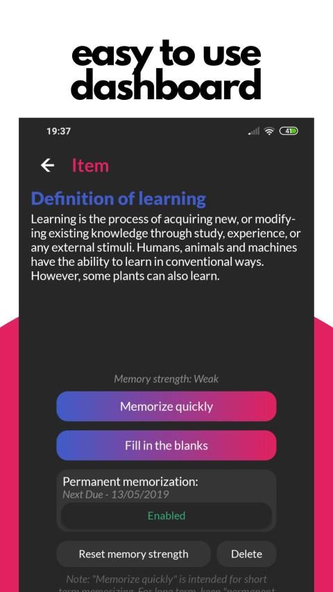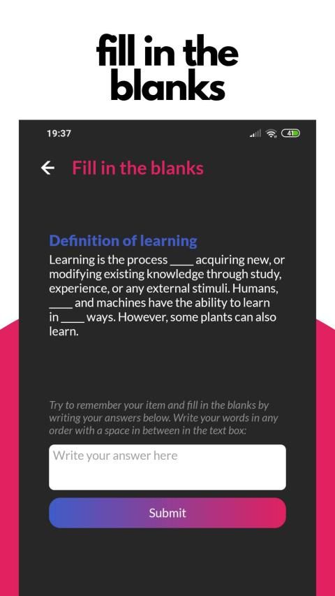 • The new update introduces a "fill in the blanks" generator which automatically generates unlimited questions of whatever you're trying to memorize. It uses cloze deletion to effectively help you test yourself, improving your memory in the process.
