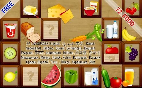 * Dapatkan akrab dengan nama-nama dan penampilan dari 72 buah-buahan umum yang berbeda, sayuran dan barang-barang makanan sarapan lainnya