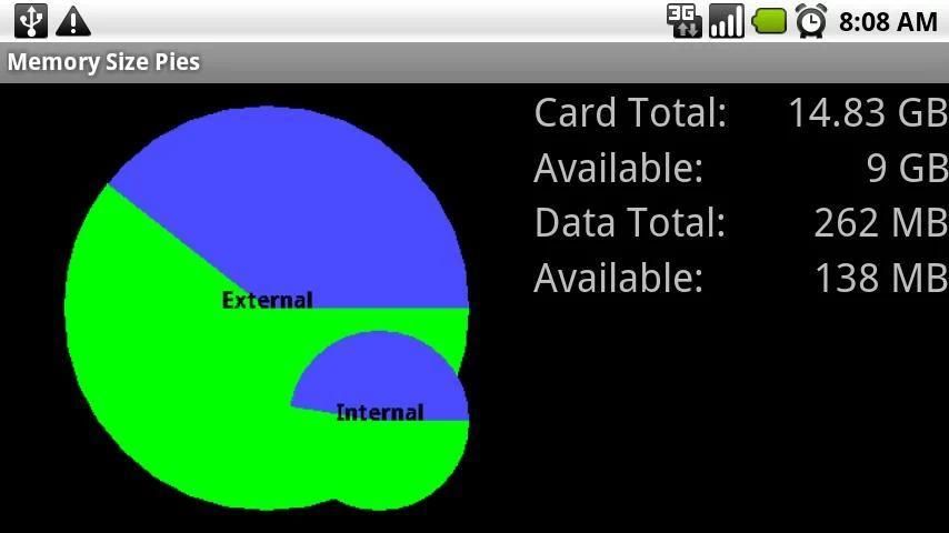 Ukuran memori Pies menampilkan ruang penyimpanan yang tersedia untuk kartu memori Anda dan memori sistem anda dalam format pie chart nyaman.