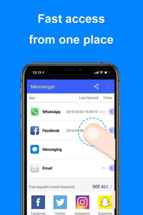 Hubungi orang-orang dari satu aplikasi secara langsung dan gratis. Messenger akan membantu Anda membuka aplikasi media sosial favorit Anda seperti Facebook, Twitter, Viber, WhatsApp, Hangouts, WeChat, Kakao talk, Telegram, Skype dan banyak lagi.