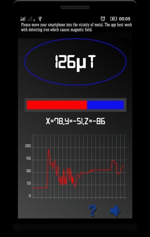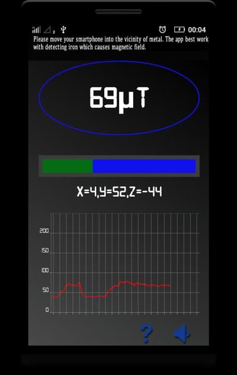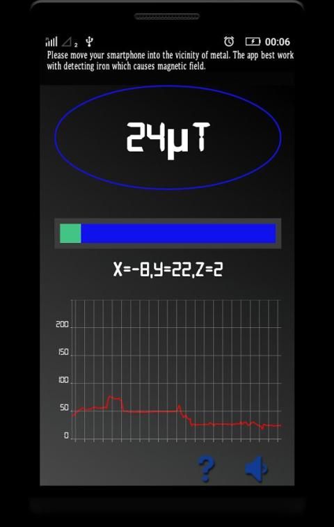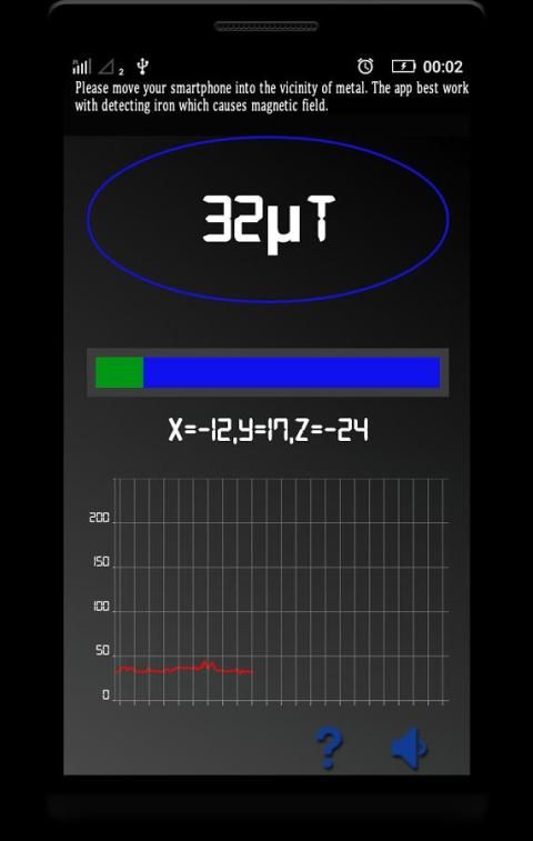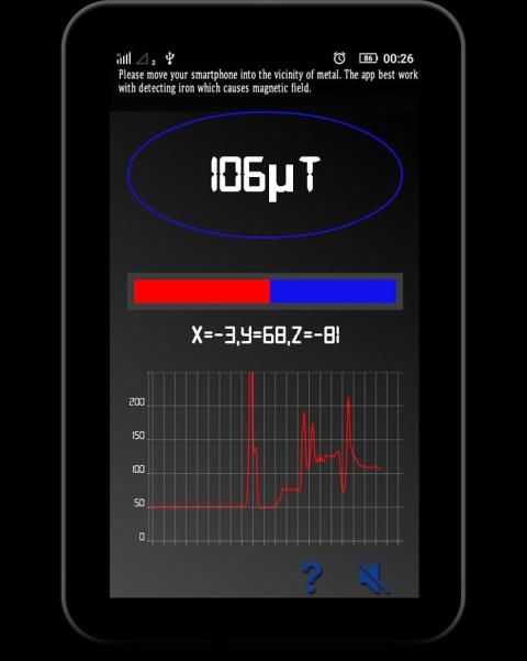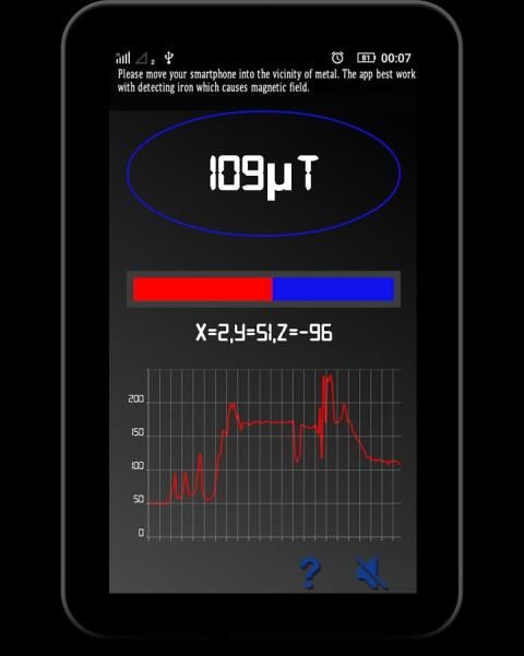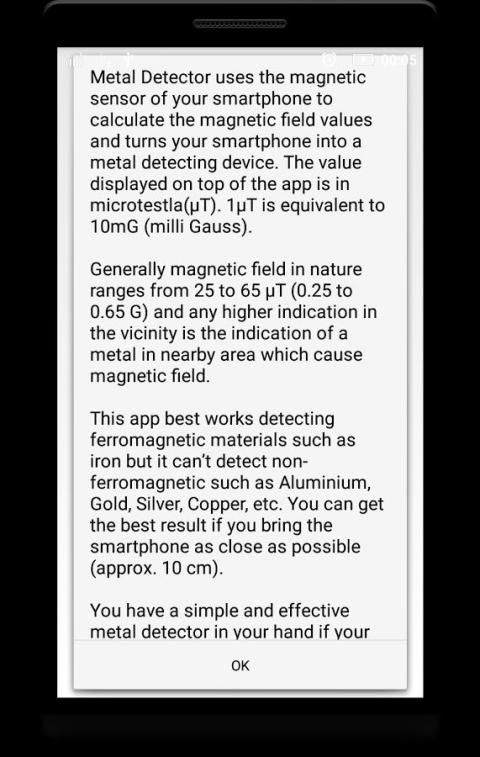 Metal Detector menggunakan sensor magnetik dari smartphone Anda untuk menghitung nilai medan magnet dan ternyata smartphone Anda menjadi perangkat mendeteksi logam. Nilai yang ditampilkan di bagian atas aplikasi ini di microtesla (μT). 1μT setara dengan 10mg (mili Gauss). Umumnya medan magnet di alam berkisar 25-65 μT (0,25-0,65 G) dan indikasi yang lebih tinggi di sekitarnya adalah indikasi dari logam di dekat daerah yang menyebabkan medan magnet.