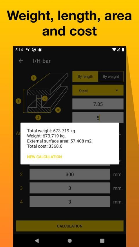 Metal Weight Calculator - is a very quick and easy app for metal weight calculation. Interactive and simple interface to get result quickly with many shapes and various metals. All calculations are carried out according to exact formulas. The density of materials is selected from engineering directories. Calculation can be made by length and weight. Each profile contains a detailed graphical diagram / drawing for convenient use of the calculator. The metal weight calculator can additionally calculate the area of painting and the total cost of the elements. Convenient and free application helps to make quick calculations of metal weight and save time. You will appreciate the extensive base of shapes and metals with a convenient filter. This metal weight calculator is made for you. The calculator is designed for true professionals.