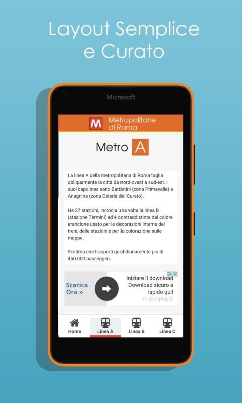 Lasciati guidare alla scoperta della Capitale, esplora le mappe ed i percorsi dell'intera linea metropolitana. Che tu sia un turista in vacanza, o un cittadino che usa i mezzi pubblici per spostarsi nel caos romano, troverai davvero comodo avere a portata di mano la soluzione giusta per te.