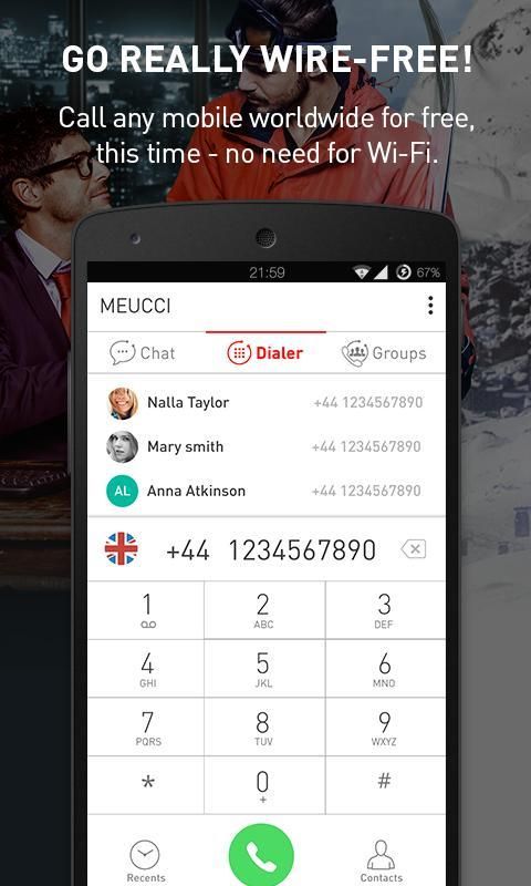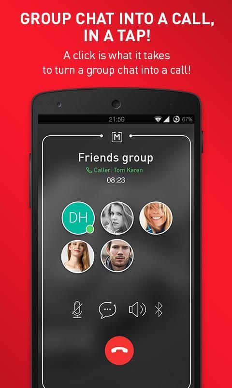 Hanya satu perlu memiliki aplikasi. Kami akan senang jika Anda mengatakan kepada teman-teman Anda tentang kami, tetapi untuk memulai, hanya pemanggil harus telah Meucci diinstal. Jangan overthink jika penerima telah aplikasi diinstal, Anda dapat memanggil atau teks mereka bebas! Dalam kedua kasus, ketika menelepon dan SMS - kontak tanpa aplikasi akan mendapatkan SMS yang menghubungkan mereka ke obrolan atau panggilan. Segalanya mungkin - menelepon dan mengobrol dengan individu atau kelompok, mengubah kelompok menjadi panggilan konferensi dan mengobrol pertengahan panggilan.