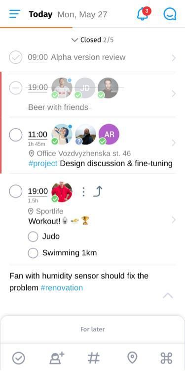 Minn allows you to easily plan your tasks, take notes and write down thoughts in your #diary; work on your #project; set up meetings with friends and discuss them in a messenger. All that in one place!