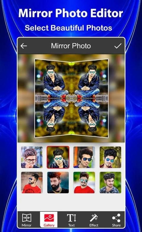 ~ Mirror Photo memungkinkan Anda untuk membuat efek refleksi cermin untuk foto Anda. Anda dapat membuat beberapa gaya foto kiri-kanan, atas-bawah, dan refleksi.