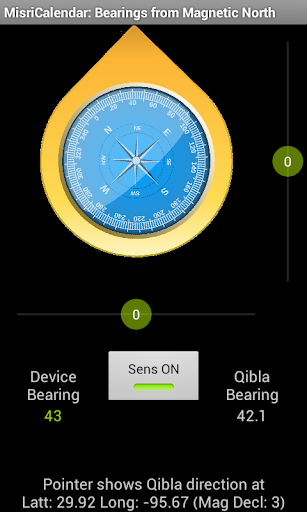 - untuk lebih baikakurasi dalam arah qibla menjaga perangkat horisontal dengan menggunakan indikator sudut pitch dan roll.
