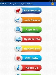 Android App yang memungkinkan Anda untuk Meninjau Optimalkan & Bersihkan Sumber Daya ponsel Anda. Anda dapat meninjau rincian sistem ponsel Anda seperti Mobile RAM Memory dan Storage Rincian Medea serta CPU Jaringan diinstal Apps dan Kecepatan dengan Sumber Daya Storage Cell Phone Cleaner.