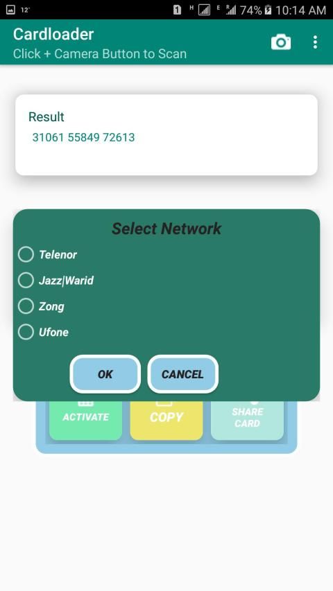 Dalam aplikasi pemuatan kartu ini, pengguna dapat mengisi ulang kartu dengan kamera, Di sini Anda cukup memindai kartu dengan nomor kartu kamera pemangkas dengan memotong fungsi gambar yang diberikan dalam aplikasi dan klik tombol aktifkan. Setelah mengklik tombol Activate u pilih perusahaan kartu Anda untuk mengisi ulang kartu