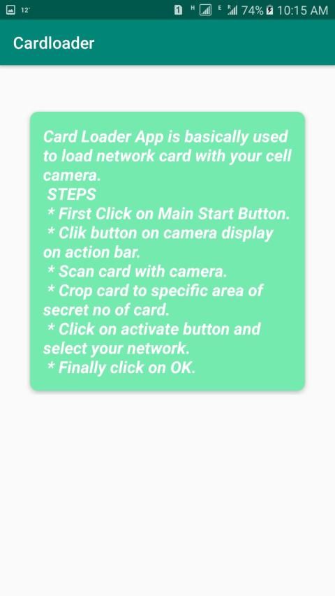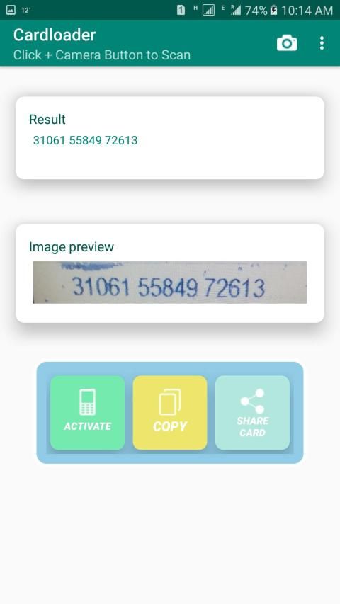 In this card load app user can recharge card by camera, In this you can simply scan card with camera crop card number by crop image function given in app and click activate button. After clicking Activate button u select your card company to recharge card