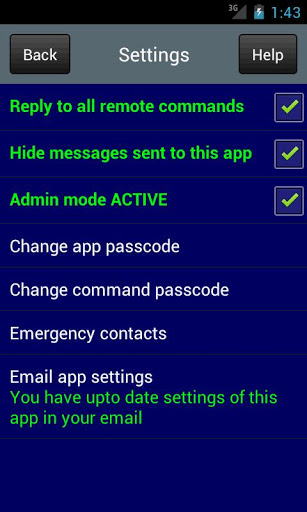 Remotely control your forgotten, misplaced or stolen Android mobile with a text message SMS.App highlights:1 Privacy: All the information provided to the App are stored privately in your mobile.2 Over 12 featuresLow battery alert, Failed unlock alert, SIM change alert, Locate, lock Wipe, Ring Siren, Call logs, SMS messages, Call forward,Contacts, Send my location3 No registration required.4 Upgrade for US 99cents.UNINSTALL:Launch the APPgt;Click SETTINGS AND Click UNINSTALL at the bottomTHE FREE VERSION EXPIRES IN 30 DAYS. SOME FEATURES EXPIRE IF APP IS NOT UPGRADED.PLEASE CHECKhttp:www.zippymobileapps.comnode7 Features:1Low battery alert: When the battery level in your mobile is critically low, the App informs you to contacts provided in the App with mobile39;s current GPS position, time and battery level along with a handy link to google maps. This is useful when the battery is completely drained and dont know where to search at.2Unlock failed alert: The App immediately informs you when someone tries to unlock your mobile and failed 5 times consecutively.3SIM change alert: App informs with NEW phone number and SIM information when someone changed your SIM in your mobile.remote control commands: i.e. an SMS text message to your Android mobile containing command and command passcode.REMOTE COMMANDS FORMAT:COMMAND lt;COMMANDPASSCODE gt;ORCOMMAND lt;COMMANDPASSCODE gt; EMAIL:lt;REPLYTOEMAILADDRESSgt; If reply email address is provided, the App tries to reply by an email to save SMS costs.4LOCATE: Find your mobile. The App replies with current GPS position of your mobile and a handy link to google maps.5RING: Make your mobile Ring with maximum volume.6CALLS: For recent calls from your mobile39;s call log.7MISSED: For recent missed calls from your mobile39;s call log.8DIALED: For recent dialedoutgoing calls from your mobile39;s call log.9RECEIVED: For recent receivedincoming calls from your mobile39;s call log.10CONTACTS: To get phone numbers of your friends from your mobile39;s contacts.11SMS: For recent sent and received SMS from your mobile to your email.12ActivateCallForward: To setup call forwarding of all the incoming calls to your mobile to another phone number. Works on all GSM mobiles, Verizon and Sprint CDMA networks in the USA.13DeactivateCallForward: Call forward will be deactivated.14LOCK: Lock your mobile with a custom message to show on your mobile39;s screen.15Wipe: Factory reset all the data on the phone in case your mobile is stolen and cannot find by any means.Please watch the video or check the slides at http:www.slideshare.netzippymobileappsmobilelocatorremotecontrolFollow the App on Facebookhttp:www.facebook.comMobileLocatorRemoteControlOnce the App is installed. Please try couple of commands to get experience with the App so that it is easy when you really need it.Examples:command passcodequot;1234quot;LOCATE 1234orLocate 1234 email:XYZ@ABC.COMLOCK 1234 EMAIL:XYZ@ABC.COM I misplaced my mobile. Please call me at 11234567890CALLS 1234 CONTACTS 1234 Mary Tom gt; i.e. App replies with phone numbers of Mary and Tom.SMS 1234ActivateCallForward 1234 1234567890 gt; App sets up call forward to 1234567890DeactivateCallForward 1234All remote commands are protected with command passcode, share with only whom you trust most.For more information,visit http:www.zippymobileapps.com.Disclaimer: The App does at its best.By installing or using this softwareApp you take full responsibility and use at your own risk with no warranty of any kind.KW:Track,Find my phone,Find my droid,Phone tracker PhoneLocator,Phone locator,PhoneFinder,Phone finder,Remote control,Call forwarding,Low battery indication,zippymobileapps,zippy mobile apps,Lost or Stolen,MLRC,Send my location