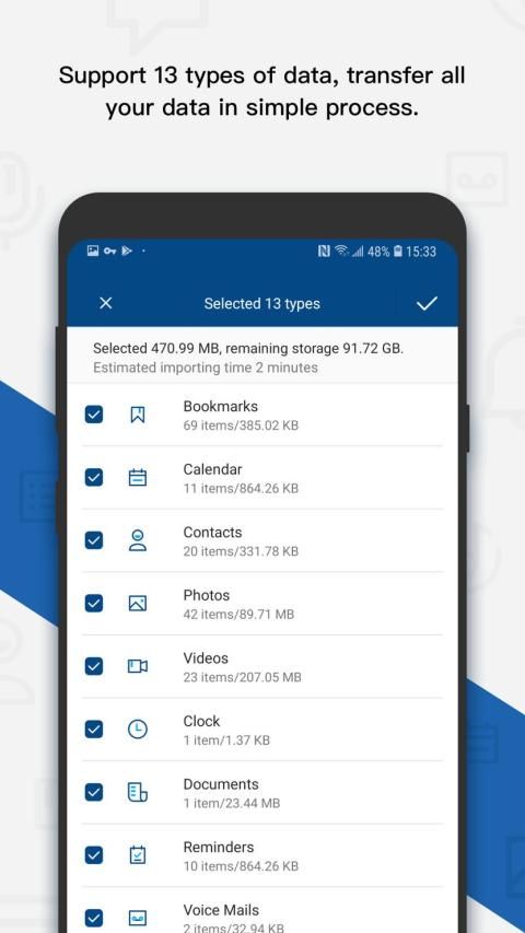 Aplikasi transfer konten ini mentransfer hingga 13 jenis file dari iOS ke perangkat Android. Anda dapat mentransfer data yang Anda inginkan, termasuk Kontak, Kalender, Pengingat, Musik, Foto, Video, Bookmark, Voicemails, Wallpaper, Nada Dering, Dokumen, Memo Suara, Jam, dll.