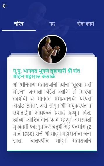 This app has Dashboard which has slider containing images. Sadhguru Shri Mohan Maharaj Bhagwat Katha, Images, Aarti. About 'Mohan Maharaj' and his Guru 'Shri Shrinivas Maharaj'