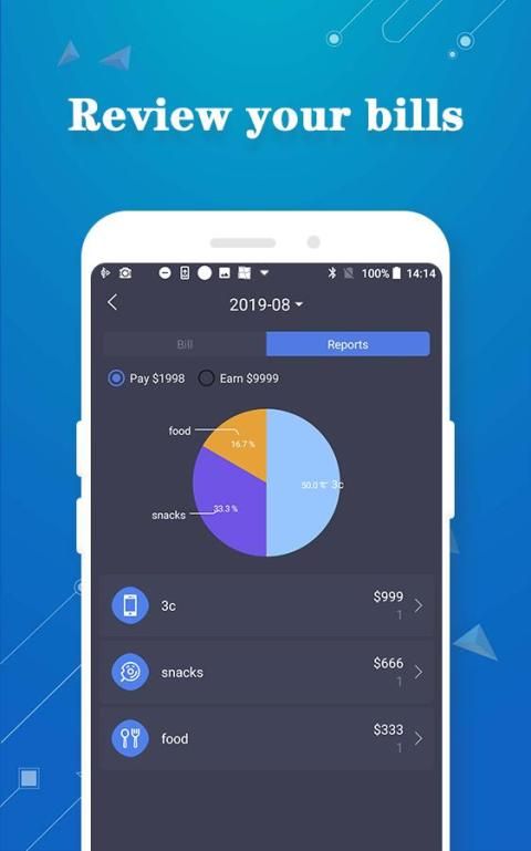 Its simple design makes it lightweight, simple and very easy to use. With a single click, you don't need to fill in anything other than the amount. You only need a few seconds a day to keep your bills.