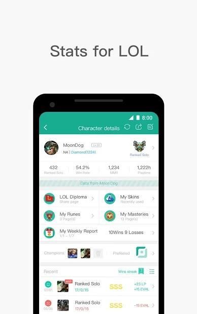 - LOL statistik: champs paling sering dimainkan, CS, K / D / A, durasi permainan, peringkat, MMR, dll
