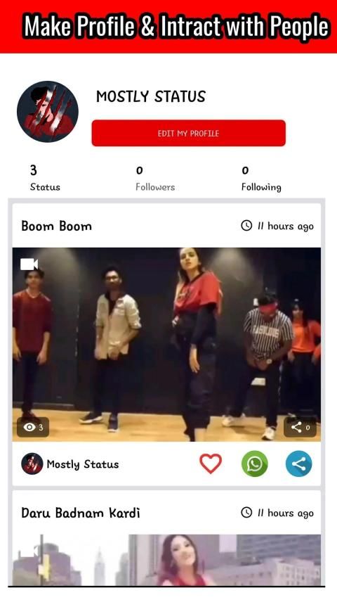 Sebagian besar Status juga mendukung SNS untuk penggemar video. Anda dapat mengikuti teman-teman Anda, atau siapa saja yang Anda suka untuk melihat apa yang sedang mereka lakukan dan menemukan lebih banyak teman baru di dekatnya dan mengobrol dengan mereka di seluruh India. Anda juga dapat mengunduh dan berbagi lagu video favorit Anda untuk WhatsApp, Facebook, Instagram, dan Twitter.