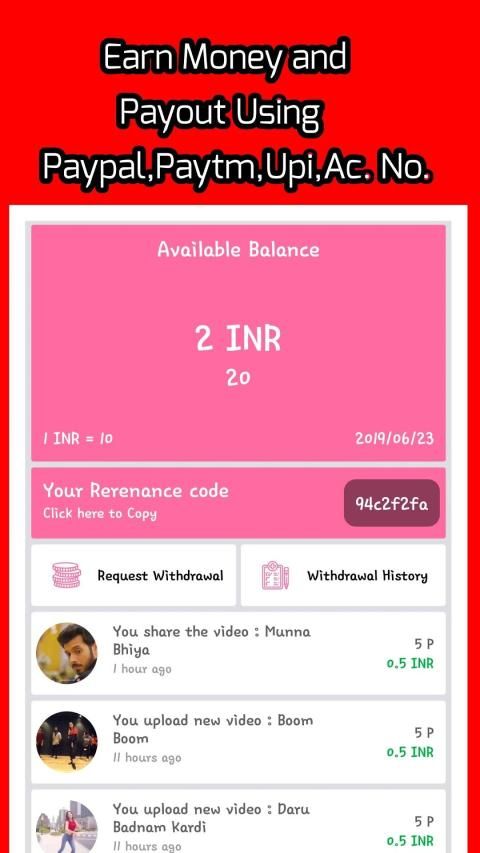 Anda dapat memperoleh poin dengan menonton video, dengan membagikannya kepada Anda teman dan anggota keluarga, dengan mengunggah video, gambar, gif. dan quot dan Anda dapat mengubahnya menjadi uang dan dapat penarikan menggunakan paytm, paypal, skrill, UPI.