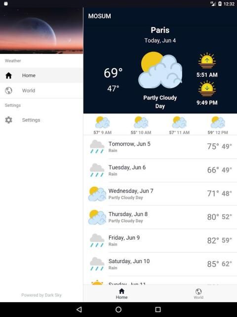 Mosum merupakan open source, NO aplikasi ADS cuaca menyediakan jam, ramalan cuaca 7-hari akurat untuk setiap kota di dunia. Anda dapat melacak semua kota favorit Anda dan tujuan dan melihat cuaca per jam / hari dengan cara yang sederhana dan indah.