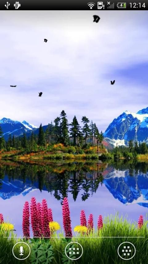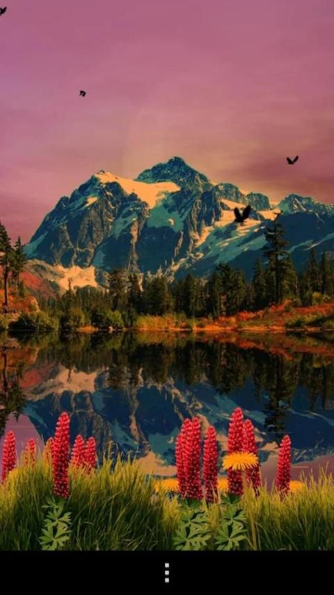 Pegunungannya mencerminkan dalam gelombang tenang santai danau. Bunga dan rumput di latar depan, burung-burung di udara dan langit hidup dengan awan, matahari dan bulan tergantung pada waktu. Mendukung bergulir horisontal pada semua perangkat.