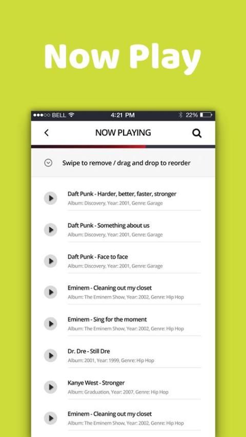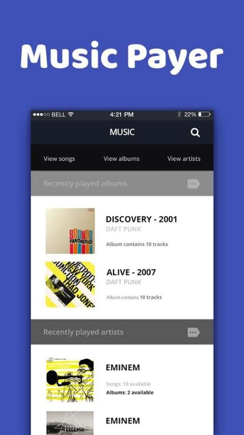 pemutar musik Powerfull untuk android, Dengan Equalizer, Mp3 player, Audio Player.You dapat mendengarkan artis dan album, atau membuat playlist sendiri dari pemain favorit Anda songs.Music tidak hanya berdasarkan artis atau album , tetapi juga berdasarkan pada desain folder untuk kulit latar belakang accessibility.Replaceable lebih baik membuat music Player luar biasa brilian.