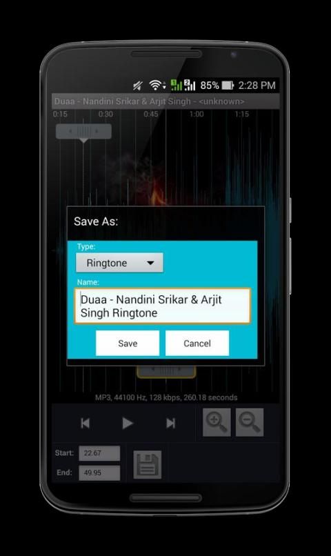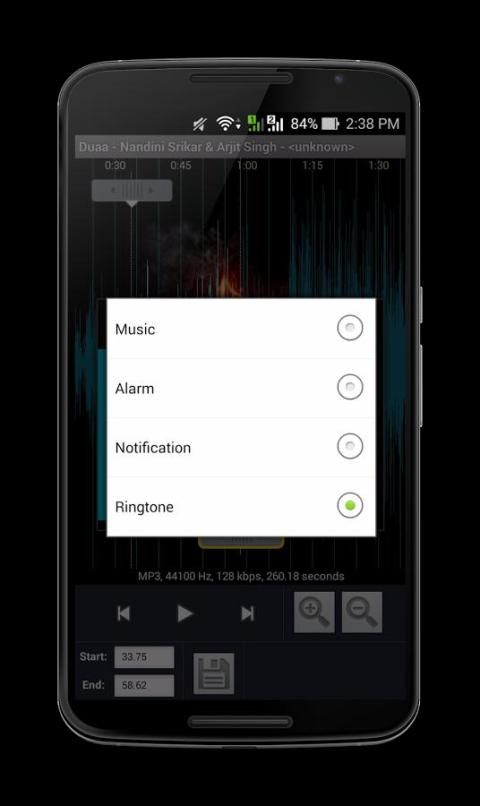 Cukup pilih MP3 / musik dari perangkat Anda. Pilih area yang akan dipotong dari file audio dan kemudian save as Ringtone / Musik / alarm / Pemberitahuan.