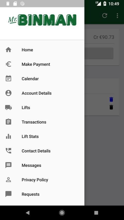 The Mr Binman app allows Mr Binman customers to view upcoming bin collections, view collection and payment history, get notified about upcoming collections and make payments to their account.