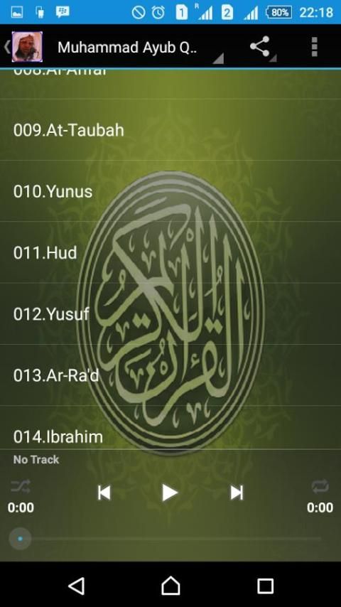 Muhammad Ayub Quran MP3: Aplikasi ini memungkinkan Anda untuk mendengarkan pembacaan Al-Qur'an lengkap Dengan Sheikh Muhammad Ayyub bin Muhammad Yusuf Dalam bahasa arab di jalan yang sangat bagus dari qira'a.You harus memilih surah dari playlist dan bermain untuk mendengarkan.