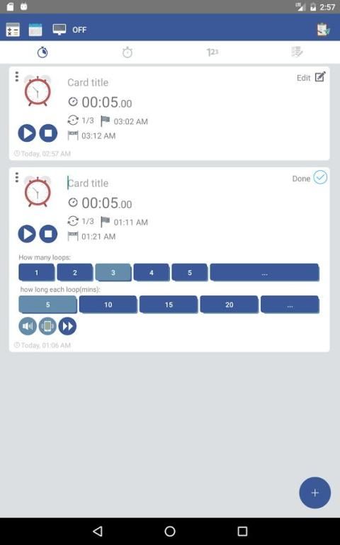 membuat banyak timer yang Anda butuhkan, mulai setiap kartu mandiri pada waktu yang sama. setiap kartu dapat dihapus digandakan dari tombol menu. halaman terpisah untuk timer dan stopwatch, menambahkan judul untuk setiap kartu untuk menjaga semuanya diatur.
