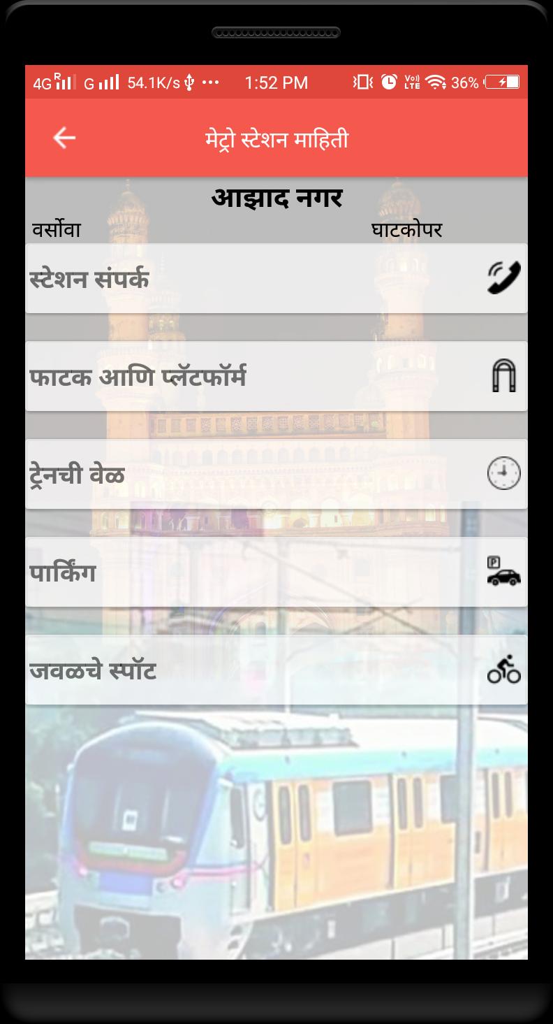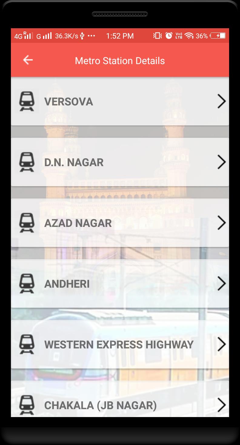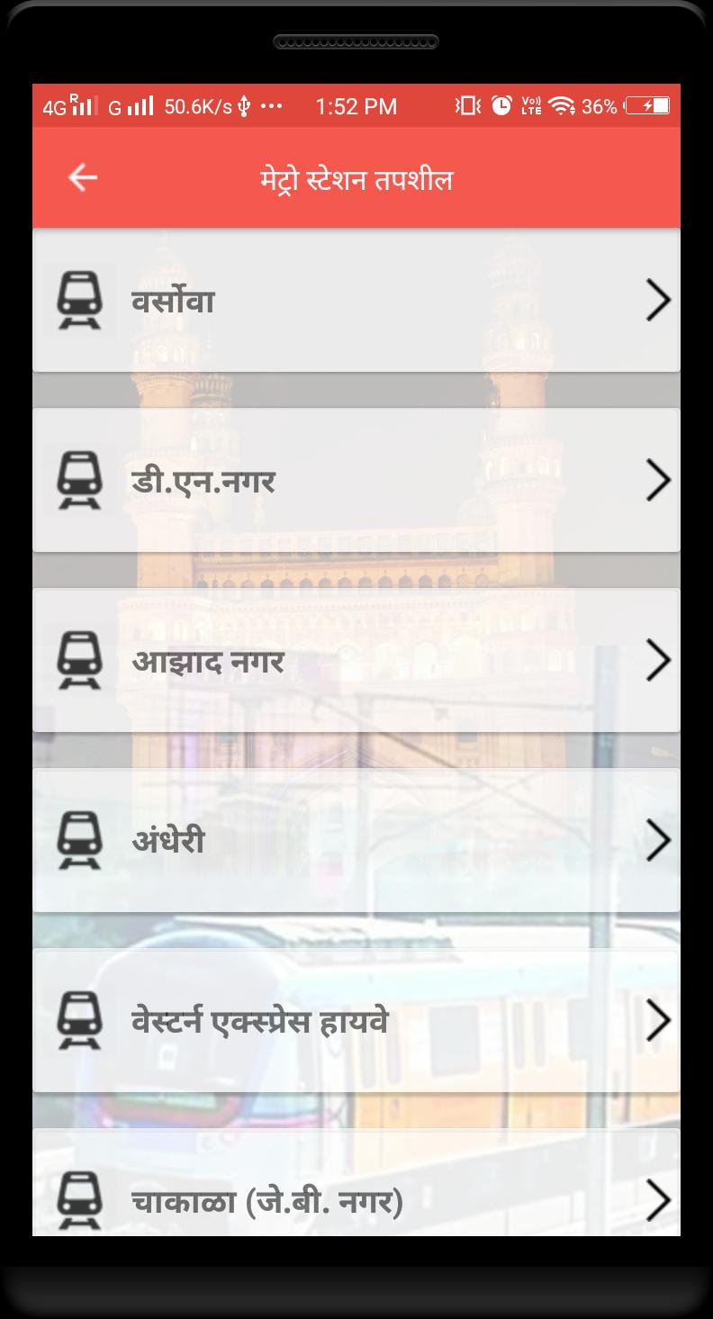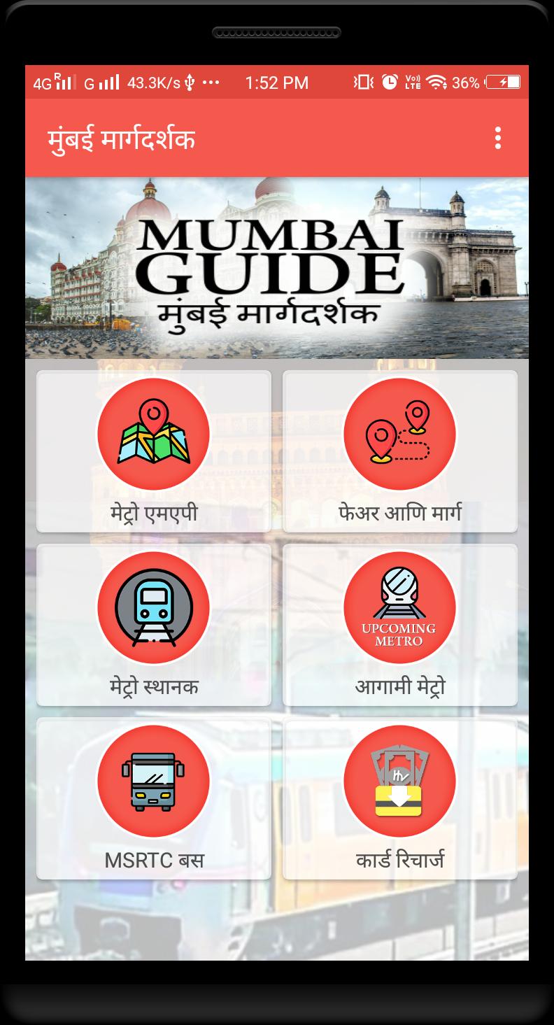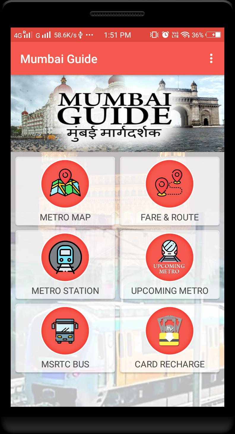 Mumbai Metro Android App provides best User Interface compare to all Mumbai metro app. In this app we have focused on the simple and elaborate designing for better understanding for the users. We have apprehended all the application standards while developing this app. In metro app we guide mumbai peoples about Metro System in best possible organized manner which is taken from the Mumbai Metro website and various public domains. This is an offline and advertisement free app.