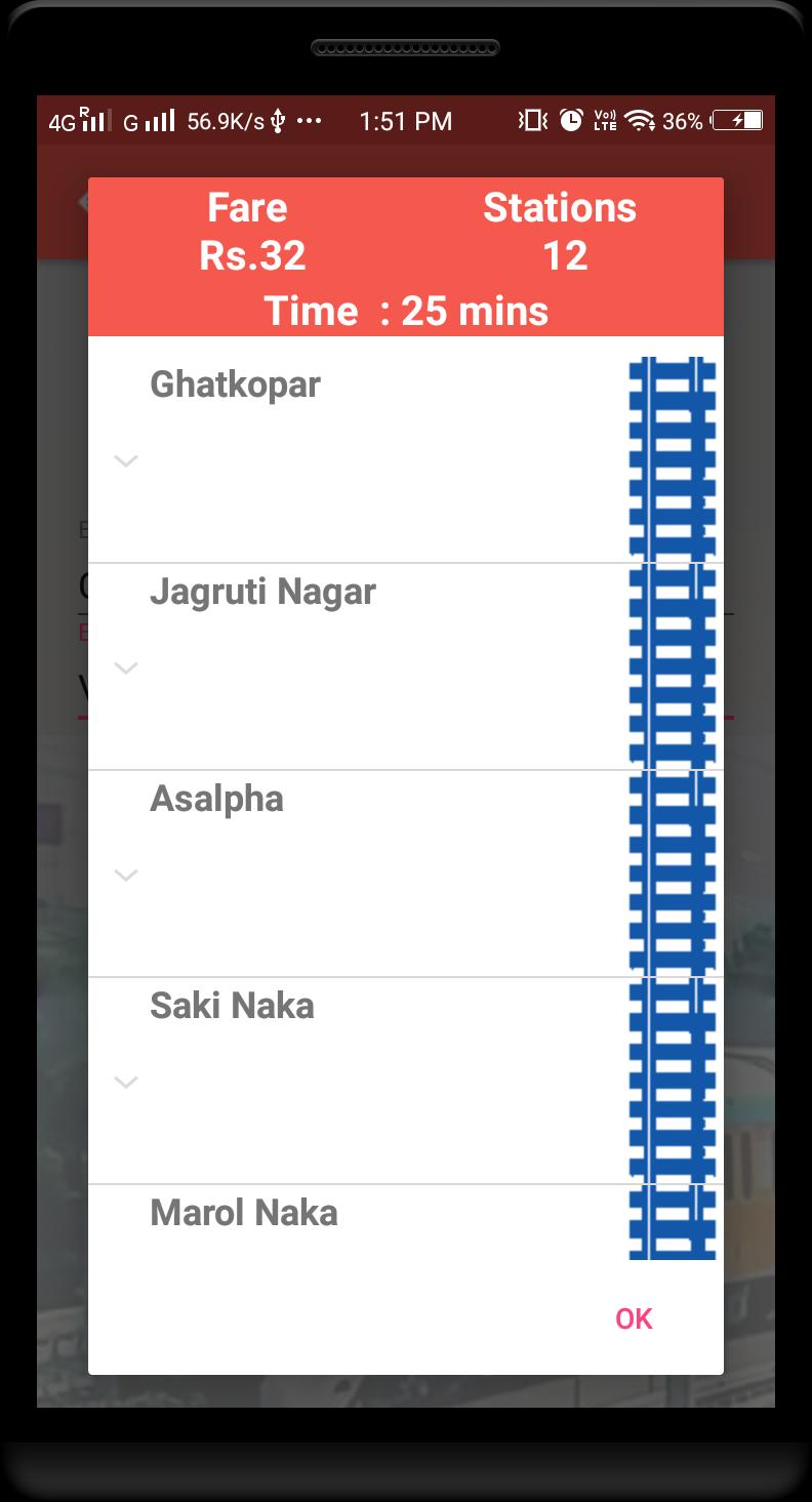 • This app shows available metro train, fare time ,distance and number of stops between two metro station. Mumbai metro Android App show first train and last train timings and train frequency of every station.