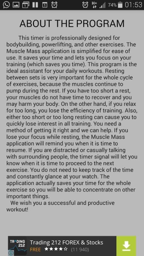 Massa Otot adalah sebuah aplikasi untuk binaraga dan powerlifting latihan yang efektif. Hal ini sangat sederhana namun praktis, dan dirancang untuk kedua pemula dan profesional.