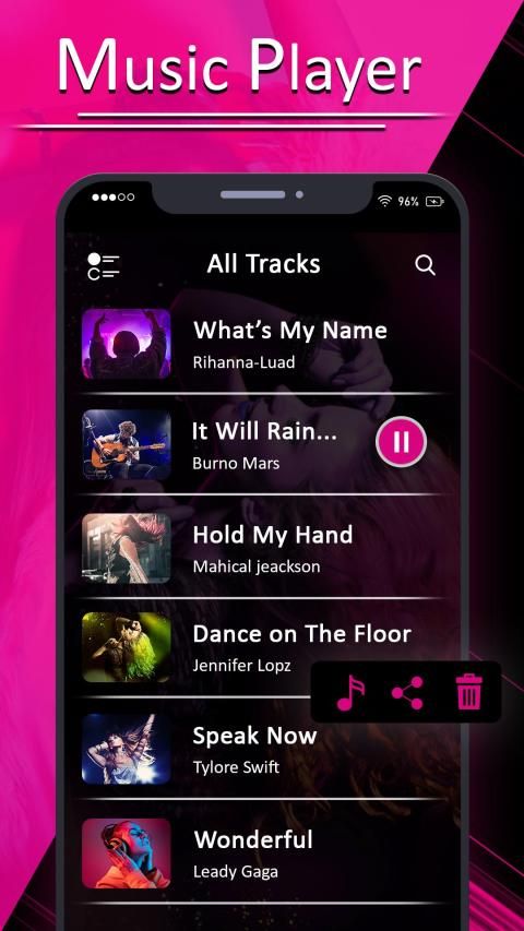 Pemutar musik dirancang untuk memberikan pengalaman yang lebih baik kepada pengguna ketika mereka mendengarkan musik. Pemutar musik memindai semua musik secara otomatis dan mengelompokkannya berdasarkan judul, artis, album. Mudah untuk menemukan lagu yang Anda inginkan. Mendukung equalizer audio untuk meningkatkan suara musik, Anda dapat menyesuaikan dengan gaya sendiri.