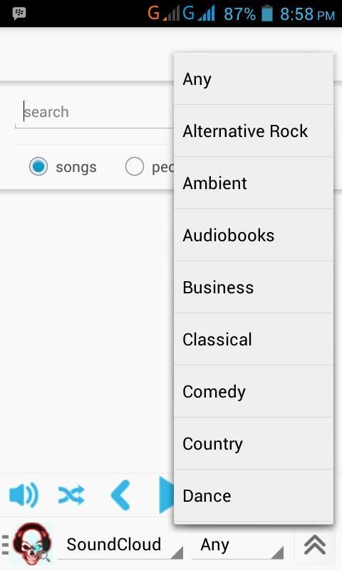 - Untuk SoundCloud tersedia lagu, genre, pengguna dan kelompok trek.