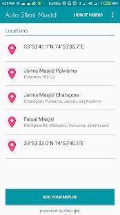 Lokasi baru ditambahkan akan ditambahkan ke Anda Musjid Daftar dan sekarang Telepon Anda akan secara otomatis dimasukkan Mode SILENT ketika Anda Masukkan ke dalam Musjid dan Pasang kembali Mode NORMAL ketika Anda meninggalkan Musjid. Anda dapat menambahkan sebanyak Musjids yang Anda inginkan.