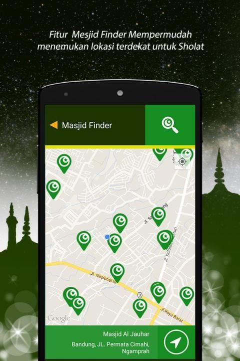 Pernah terjebak disuatu daerah dan tidak tau dimana Masjid ? Gunakan fitur ini untuk menemukan Masjid terdekat dengan kamu. Fitur temukan Masjid ini akan menghitung jarak antara kamu dan masjid terdekat dan menampilkannya pada peta.