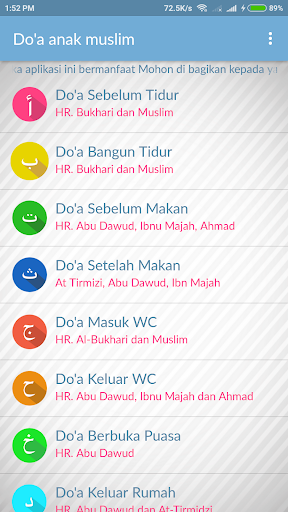 Pada Aplikasi ini terdapat beberapa kumpulan doa anak muslim dalam doa arab, doa latin dan juga terjemahnya sehingga anak muslim dapat belajar doa sehari-hari dengan mudah. Aplikasidi lengkapi dengan suara untuk memudahkan melafadzkan doa-doa tersebut.