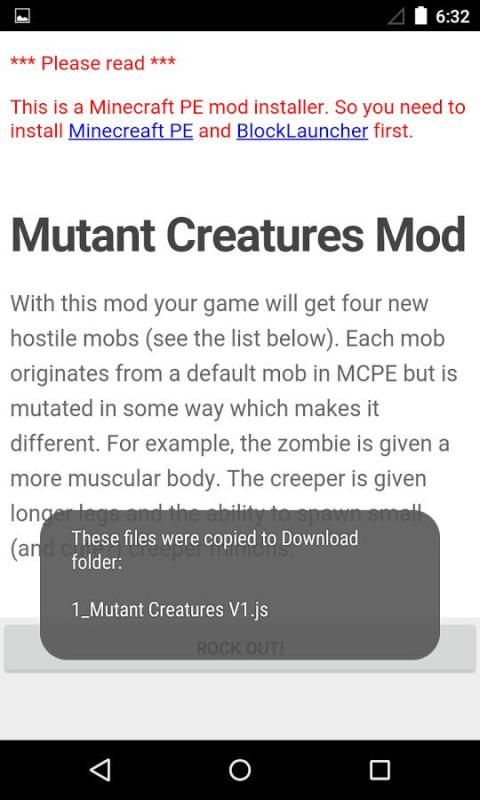 Note: "Mutant Mod Installer" just adds mods to download folder in your android device. You need to have Minecraft: Pocket Edition and BlockLauncher for the Mutant mods to work.