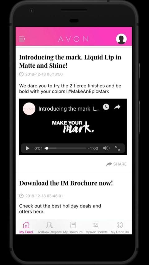 MyAvon App is the ultimate app for the on-the-go representative for sharing content on social media, new products, new brochure to shop, signing up prospects, and more.