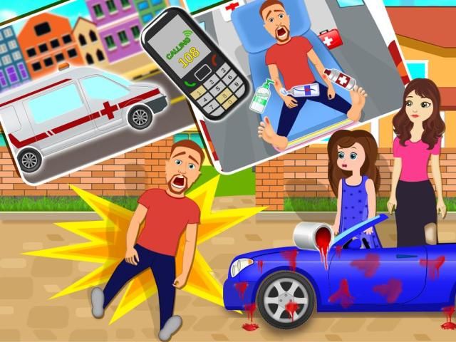 Mom met with an accident. Please help her to call ambulance and give treatment to that injured man.