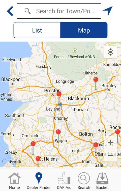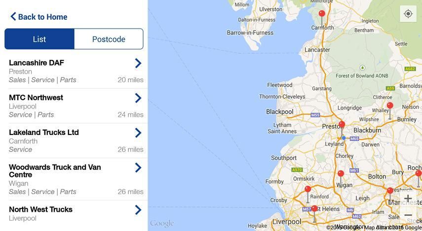 Aplikasi ini menggunakan GPS untuk menemukan posisi Anda saat ini di mana saja di Inggris dan dapat memberikan arah ke dealer terdekat.