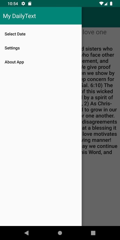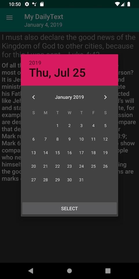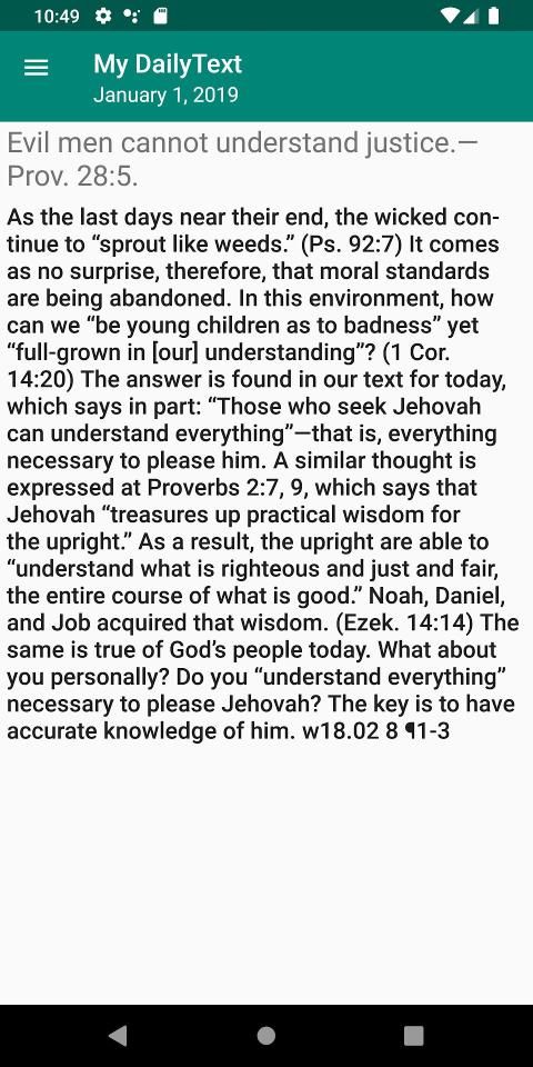 My DailyText is a small, very simple application designed for Jehovah's Witnesses. This light-weight application easily and quickly allows anyone to read the daily text (Examining the Scriptures Daily) from their internet enabled device. Perfect for those who may not have space to install the official Library app or would like to receive handy, configurable reminders to read each day.