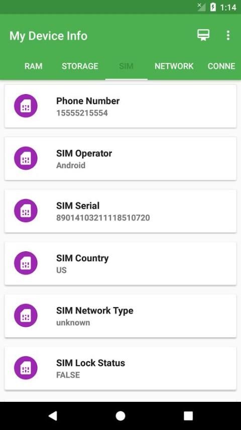SIM : Nomor Telepon, SIM operator, SIM Serial, SIM Negara, Jaringan SIM Type, SIM Lock Status.
