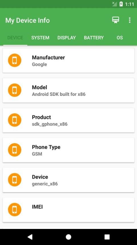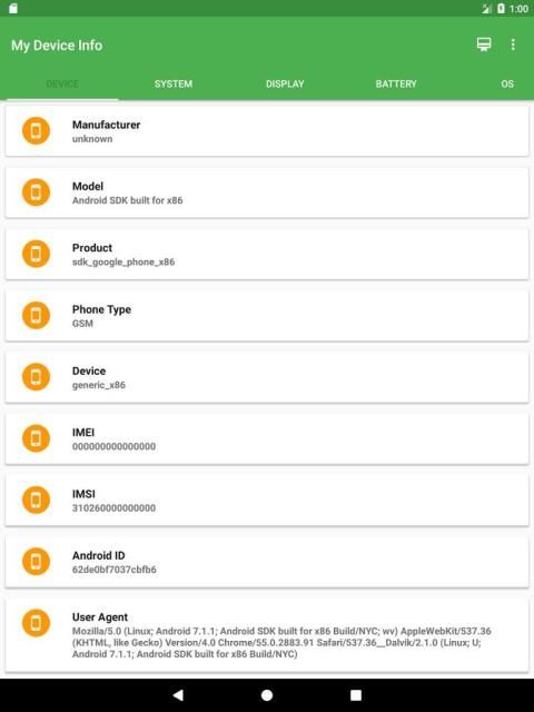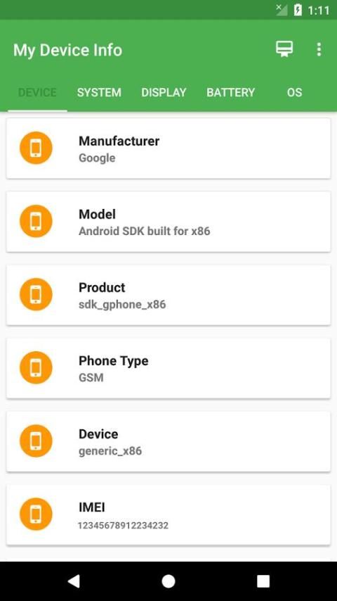 Sistem : Perangkat, OS Version, Bahasa, Rilis Membangun Version, Membangun Kode Versi Nama, Fingerprint, Hardware, Dewan, Radio Version, Tampilan Versi, Membangun Brand, Membangun host, Membangun Waktu, Membangun Pengguna, SDK Version, Membangun Serial.